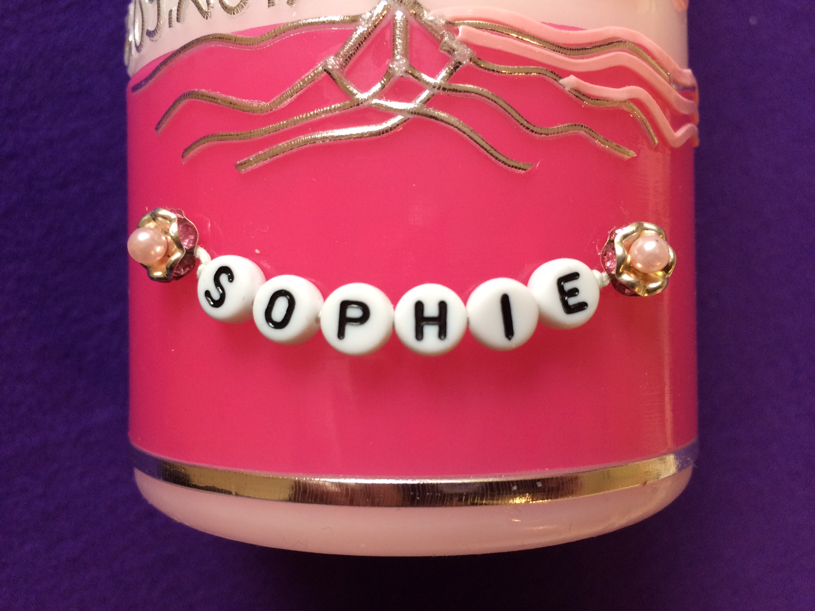 Der Vorname Ihres Kindes wird aus Buchstabenperlen gelegt und an der Kerze angebracht.