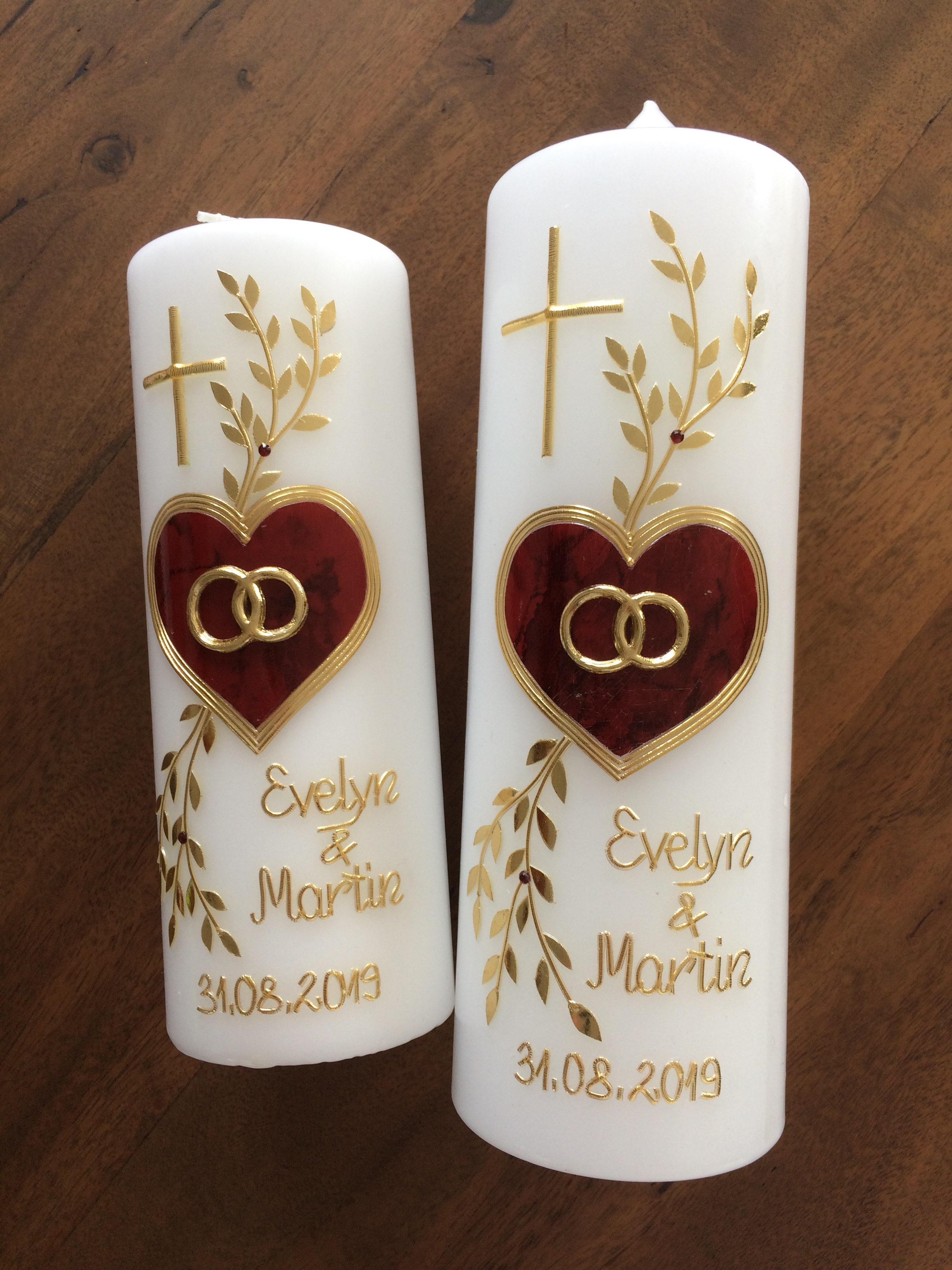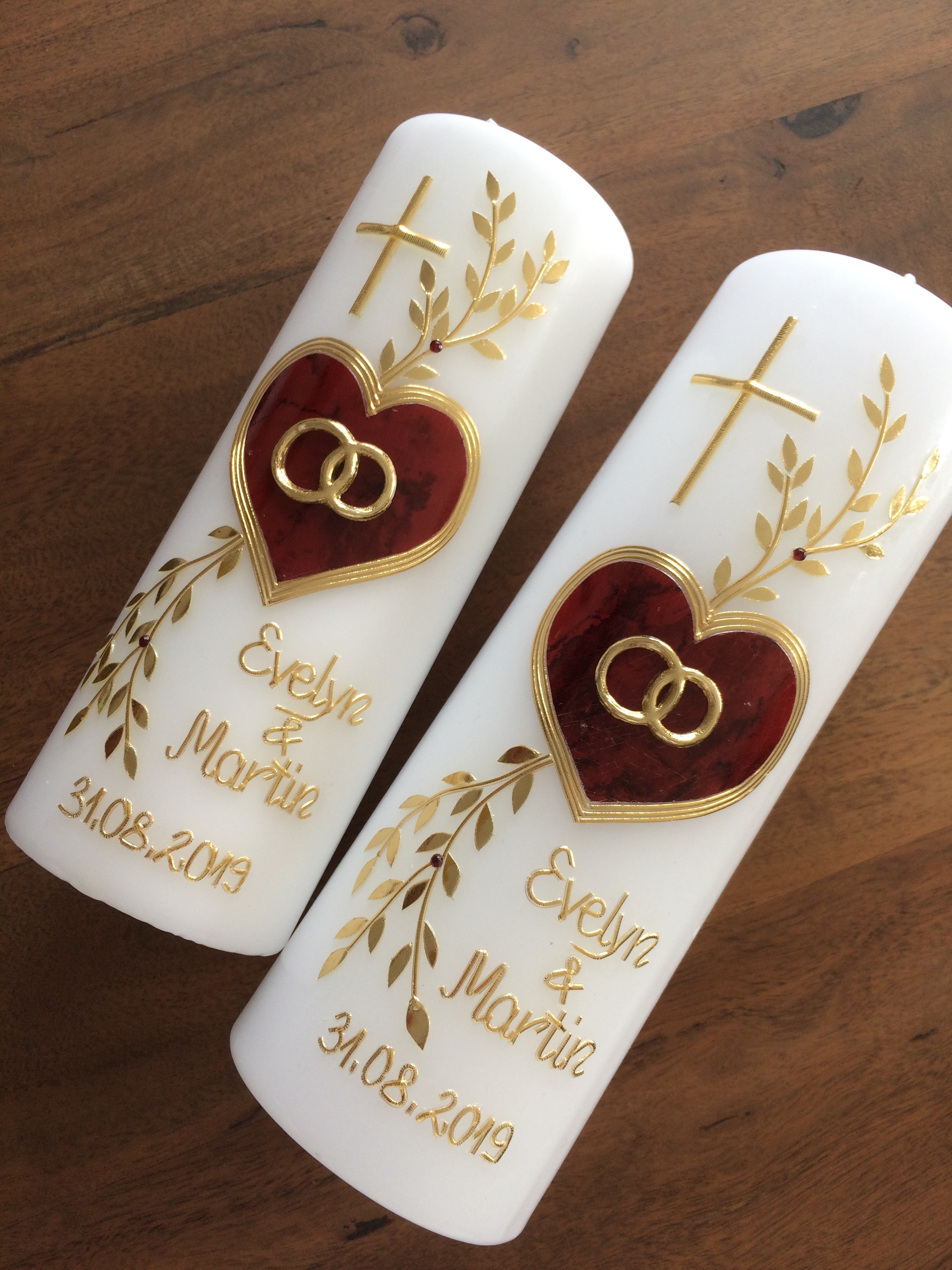 Die gewünschten Beschriftungen ( 2 x Vorname + 1 x Datum pro Kerze) sind im Kaufpreis enthalten.