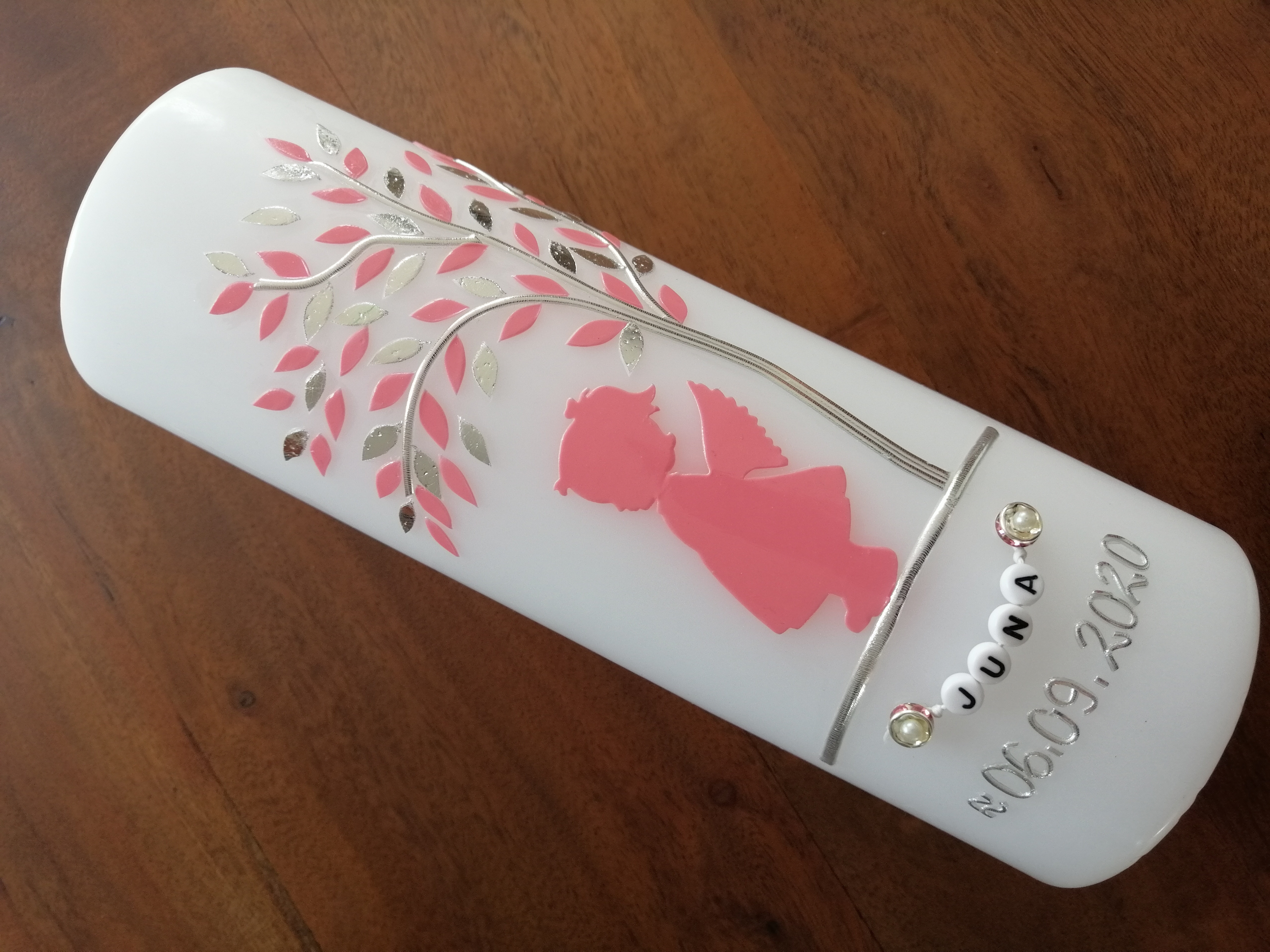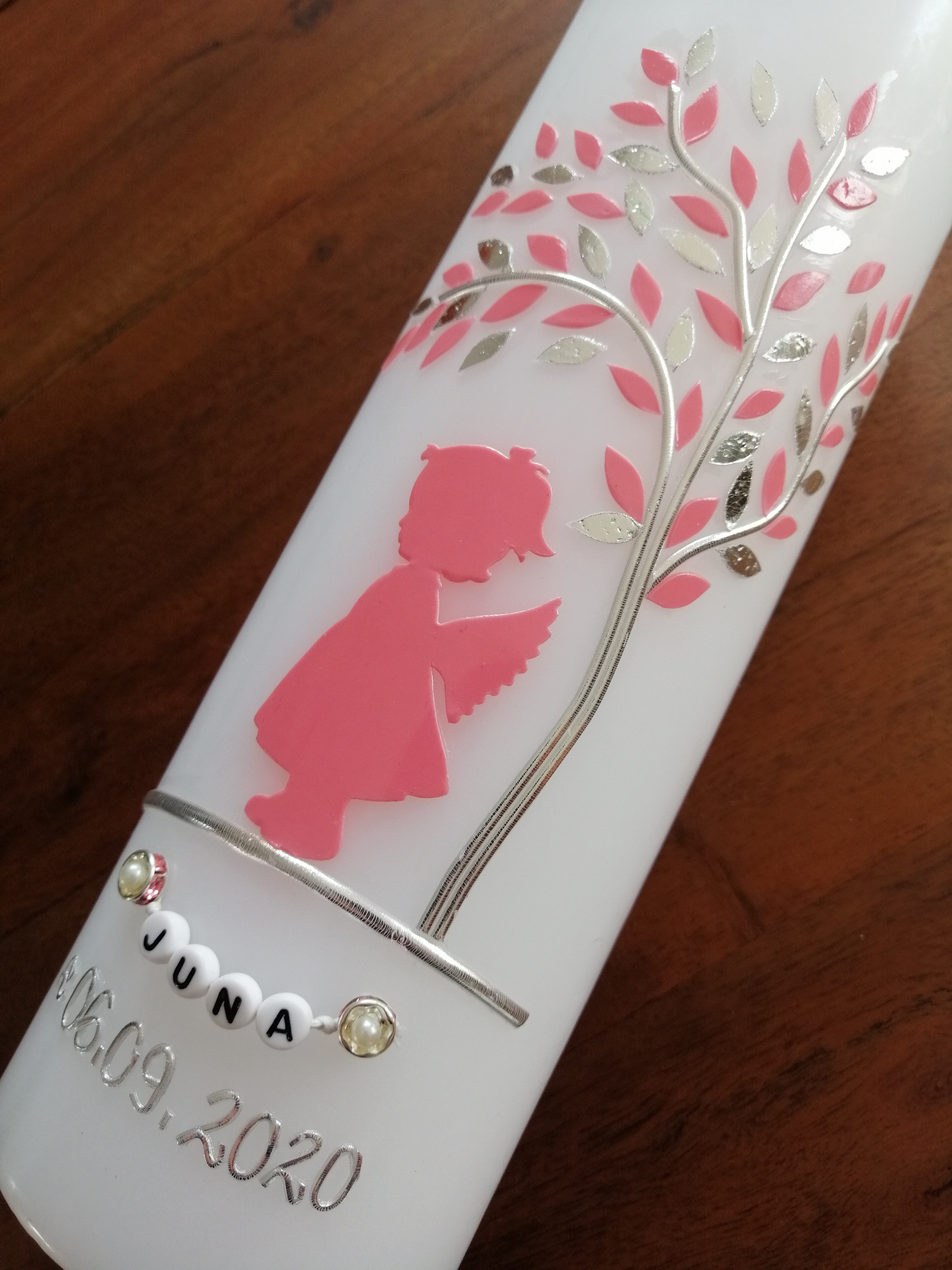 Alternativ zu den abgebildeten Kunststoffperlen kann der Vorname auch mittels unserer handgearbeiteten Wachsbeschriftung angefertigt werden.