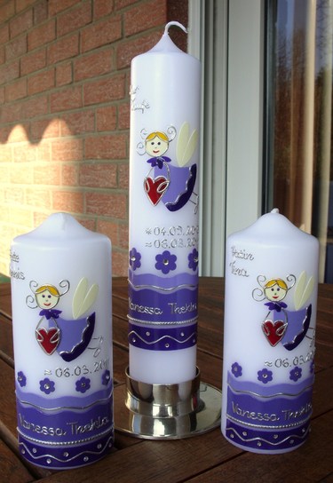Die gewünschten Beschriftungen ist bei allen drei Kerzen im Kaufpreis enthalten.